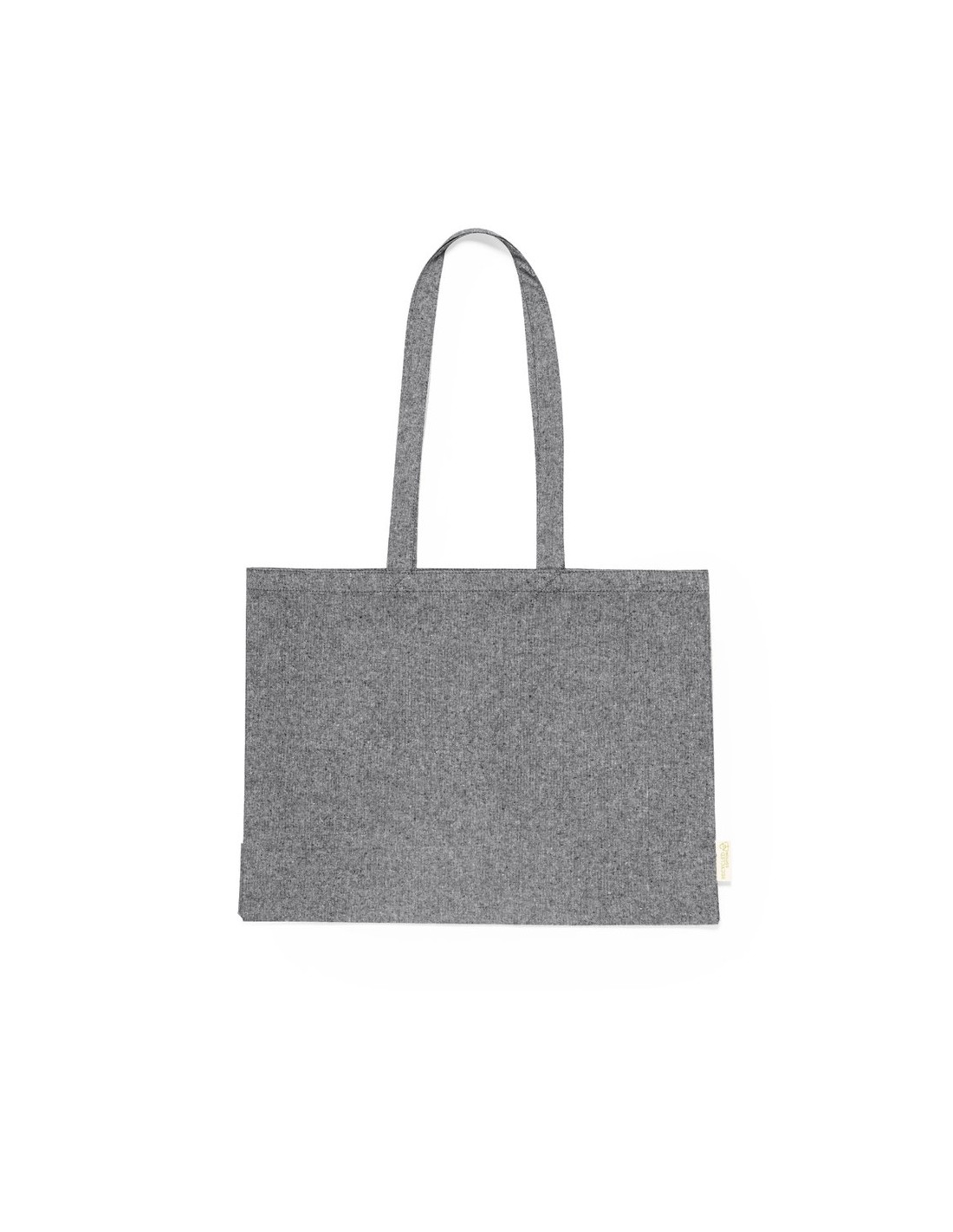 Bolsa de línea nature, fabricada en algodón reciclado de alto gramaje (240g/m2). De acabado cosido y con asas largas reforzadas (70 x 2,5 cm). Con fuelle y disponible en colores natural y negro, con distintivo algodón reciclado en etiqueta exterior. Resistencia hasta 10 kg de peso.Certificación GRS (Global Recycled Standard / Estándar de Reciclaje Global), que garantiza el origen reciclado del material usado para fabricar el producto 100% Algodón Reciclado 240 g/ m2