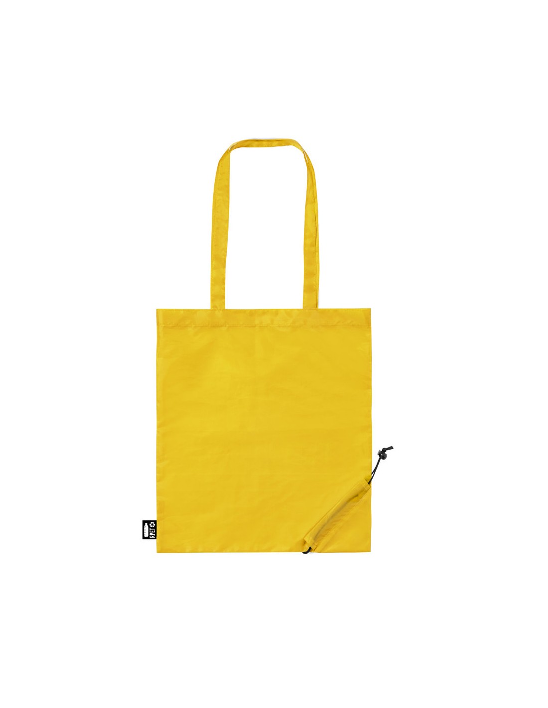Bolsa plegable de línea nature fabricada en 190T RPET. De acabado cosido y con asas largas reforzadas (70 x 2,5cm). Plegado de pequeño tamaño mediante cordón con accesorio de ajuste. Disponible en variada gama de colores, con distintivo RPET en etiqueta exterior. Resistencia hasta 8 kg de peso. El material RPET se elabora a partir de plástico reciclado, para así fomentar la reutilización de residuos plásticos y ayudar a la sostenibilidad del planeta. Poliéster RPET