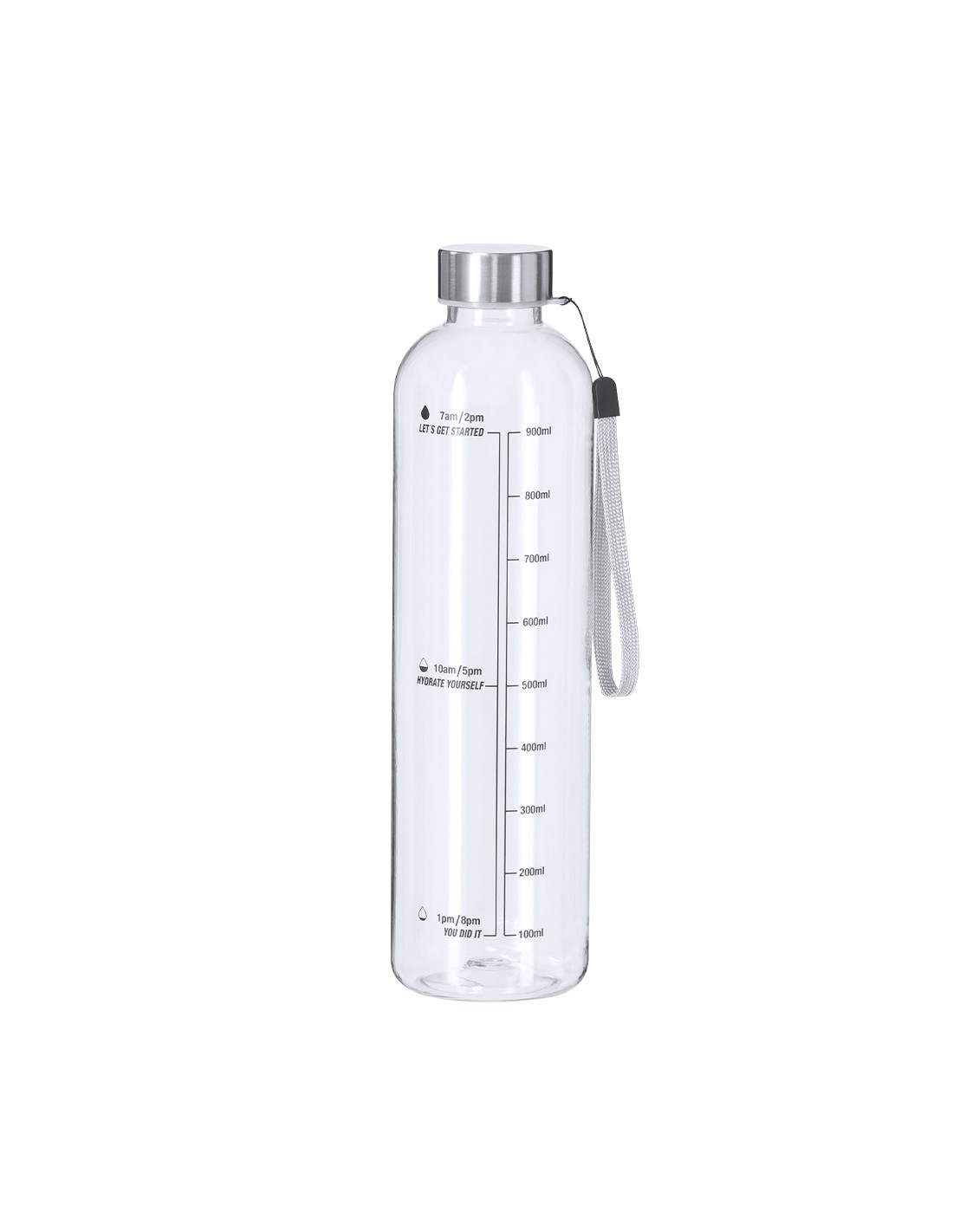 Bidón fabricado en RPET de 1L de capacidad, diseñado para fomentar una hidratación adecuada. Con cuerpo transparente. Incluye indicador de capacidad en litros y onzas, acompañado de frases motivadoras que inspiran a mantener una correcta hidratación diaria. Tapón, elaborado en Acero Inox, incluye práctico cordón para facilitar su transporte. Libre de BPA. 1 L RPET/ Acero Inox