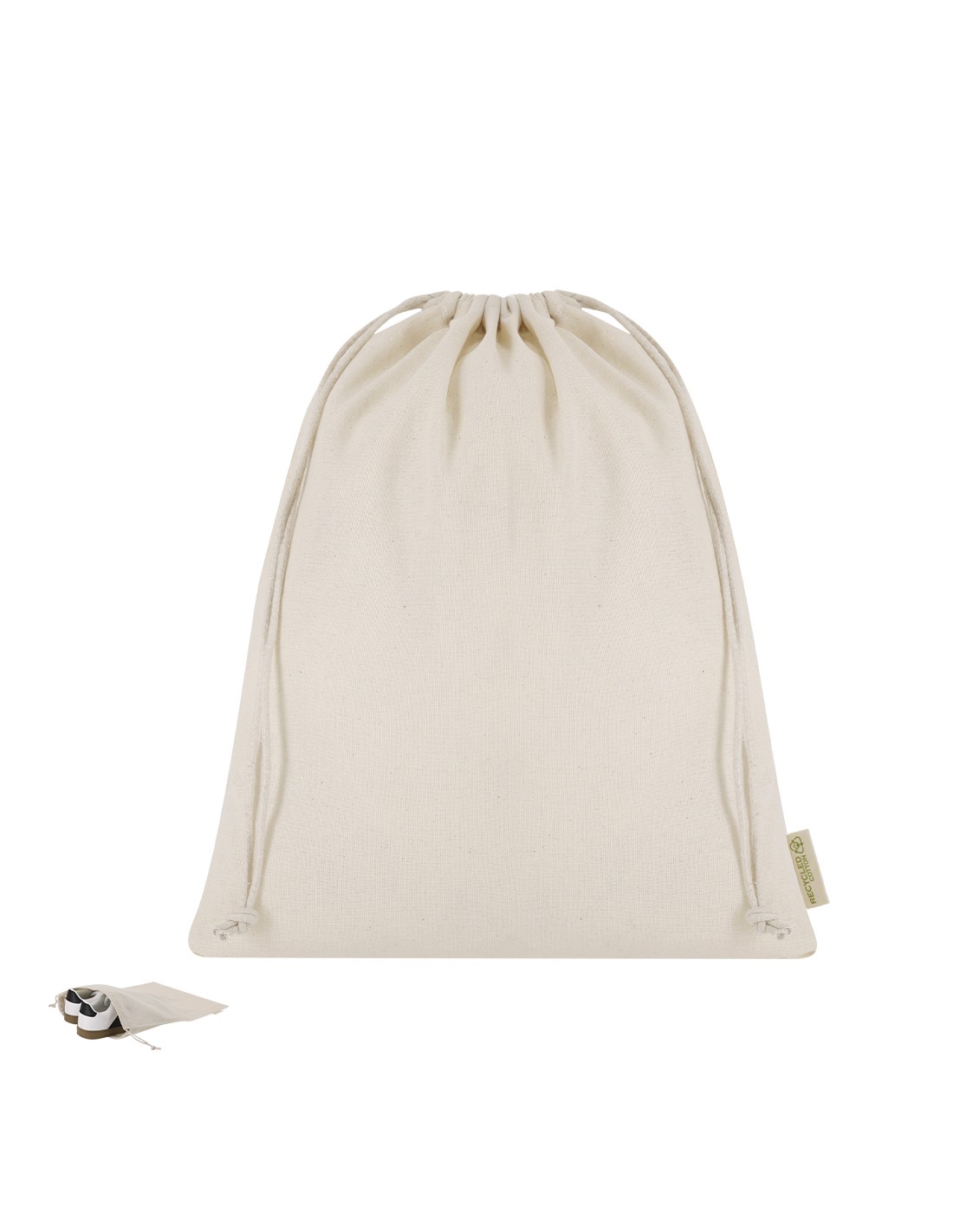 Bolsa en algodón reciclado120g/m2. Con cordones para ajustar cierre. Resistencia máxima de 4 kg. Logotipo en etiqueta lateral. Algodón Reciclado/ Poliéster RPET 120 g/ m2
