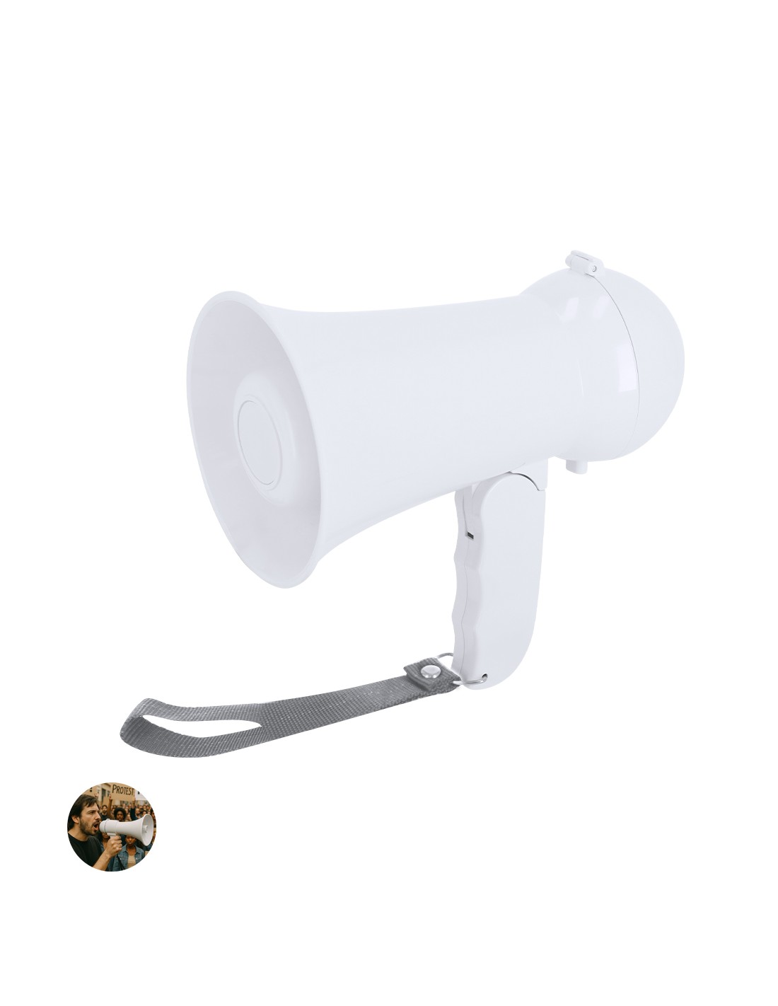 Megáfono plegable en ABS en color sólido con acabado brillante. Incluye botones de control en el extremo, sirena, grabadora, ON/OFF y control de volumen. Asa plegable con correa fija en color gris unida mediante anilla metálica. Funciona con 4 pilas AA (no incluidas). Plegable. Función Grabadora y Sirena. 4 Pilas AA No Incluidas