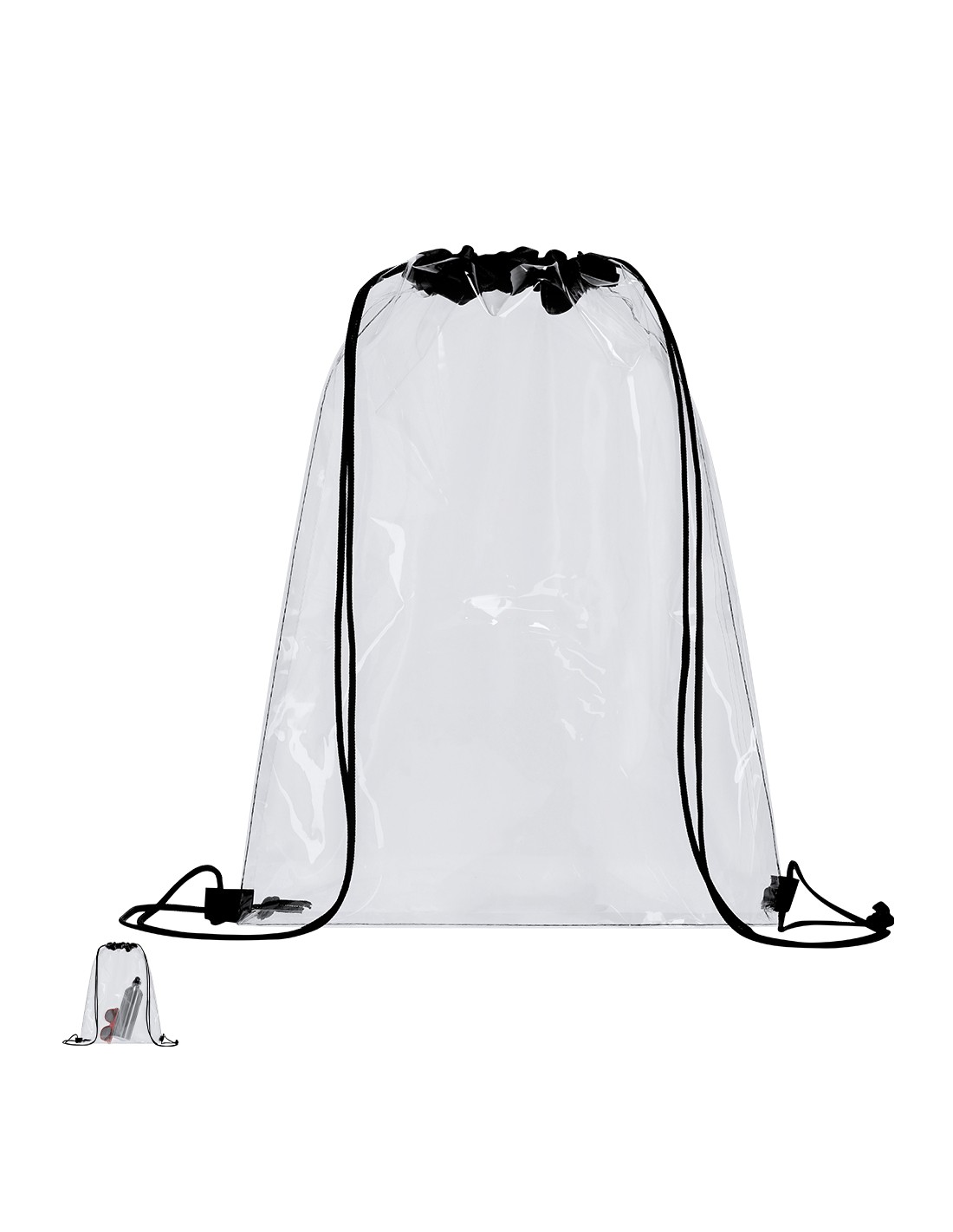 Mochila de cuerdas en PVC, con compartimento principal de diseño transparente. Cuenta con cuerdas de autocierre . PVC