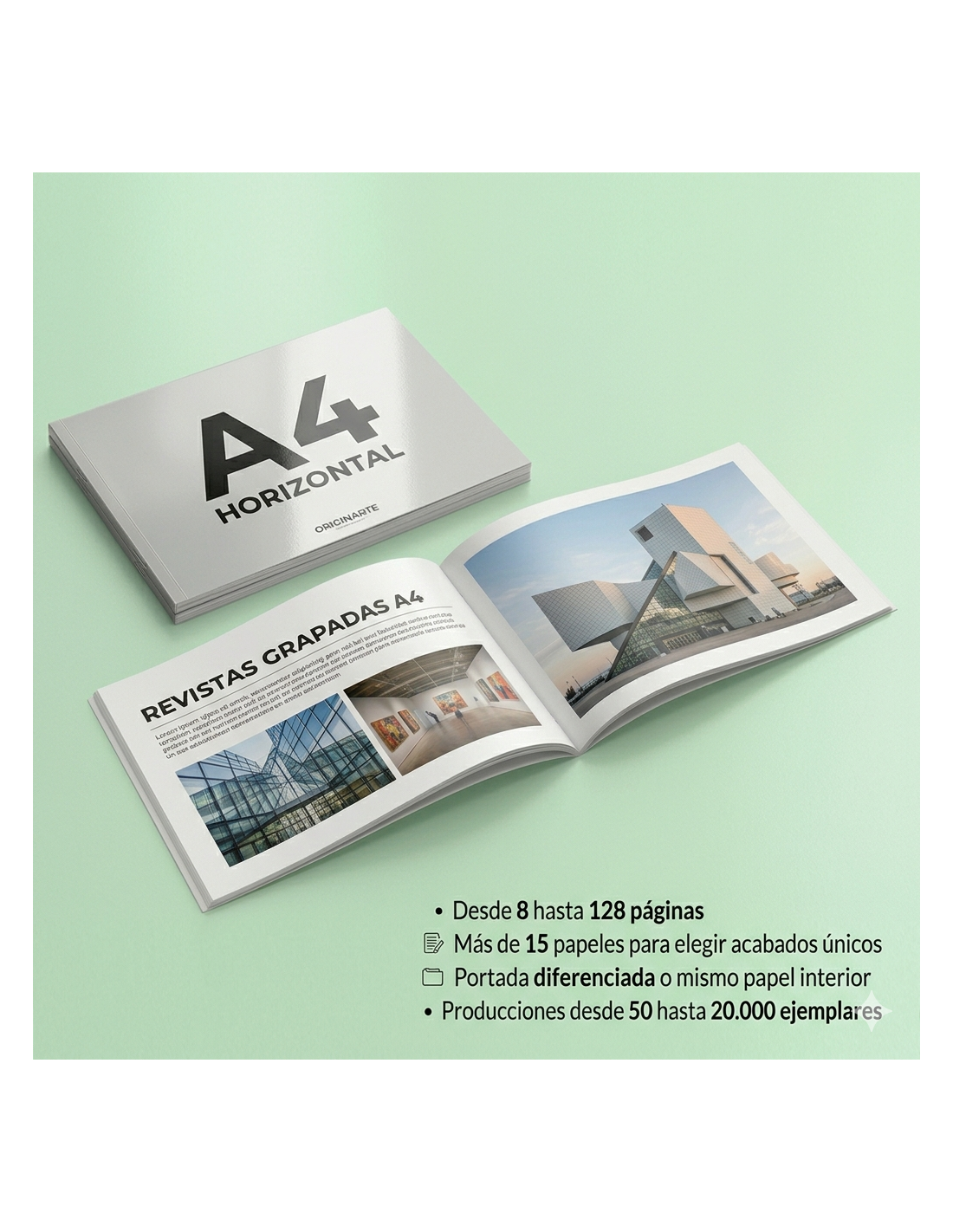 Revista o catálogo encuadernado con grapas, tamaño cerrado A4 apaisado (29,7x21 cm), con entrega GRATIS en uno o dos días posteriores al tiempo de producción elegido.