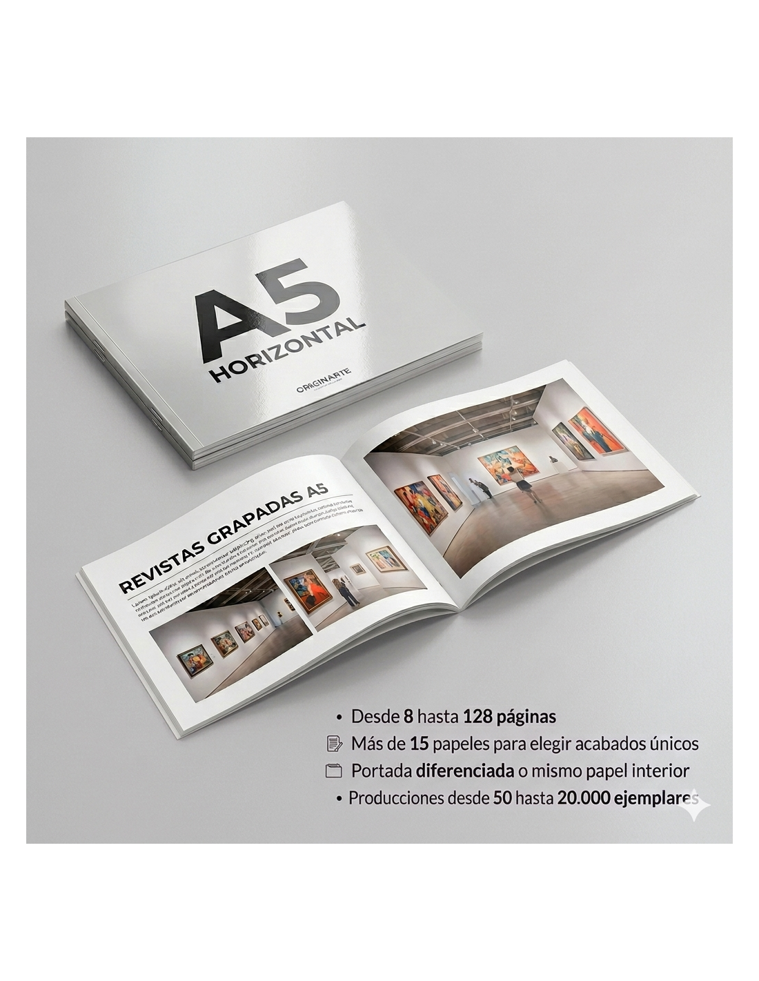 Revista o catálogo encuadernado con grapas, tamaño cerrado A5 apaisado (21x14,8 cm), con entrega GRATIS en uno o dos días posteriores al tiempo de producción elegido.