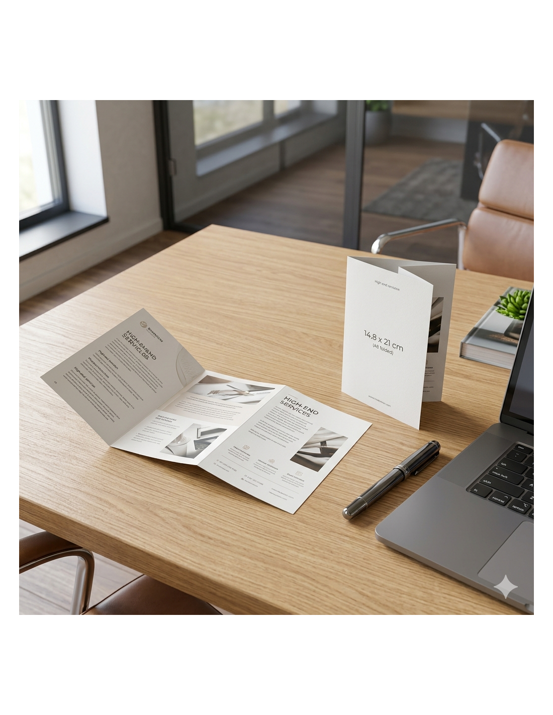 Impulsa la imagen de tu negocio con nuestros folletos plegados en tamaño cerrado A5. Es el formato ideal cuando buscas el equilibrio perfecto: suficiente espacio para comunicar tus ideas y un tamaño manejable que tus clientes querrán conservar. Ya sea para un catálogo de productos, una carta de restaurante o un programa de eventos, nuestros folletos ofrecen un acabado premium que marca la diferencia.