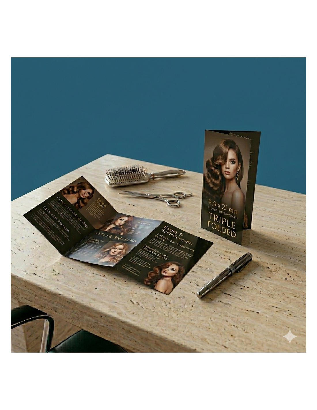 El formato 105x210 mm ofrece una lectura vertical muy cómoda. Al plegarse (de 4 a 12 páginas), permite segmentar tu oferta de manera lógica: una cara para la portada, caras interiores para tus servicios y una contraportada para el contacto y mapas.