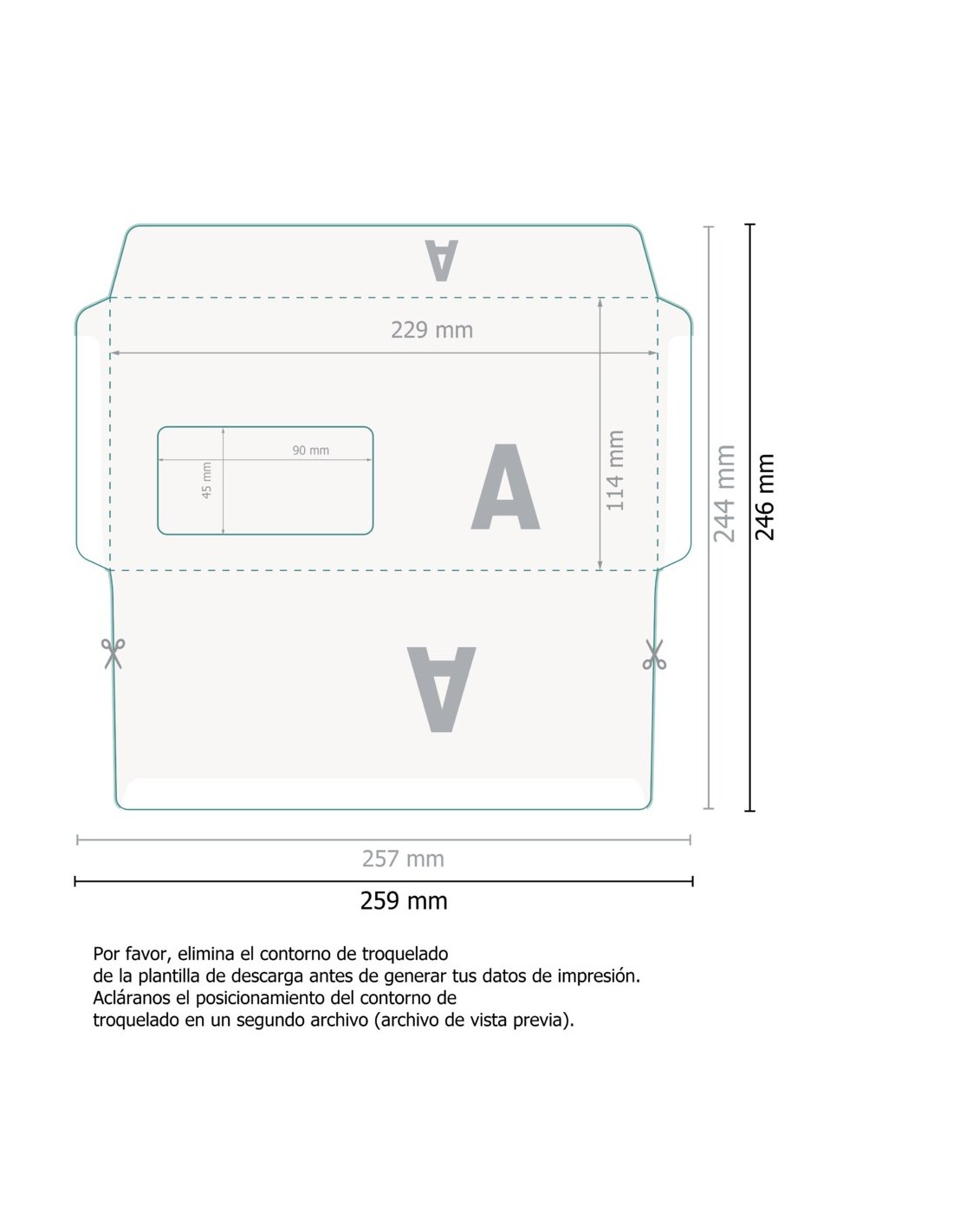 ¿Cómo debo preparar el archivo de impresión? Es fundamental utilizar nuestra plantilla técnica para situar tus logos y textos siguiendo fielmente el perfil de troquel, asegurándote de que el diseño no interfiera con la zona de la ventana si has elegido esa opción.
