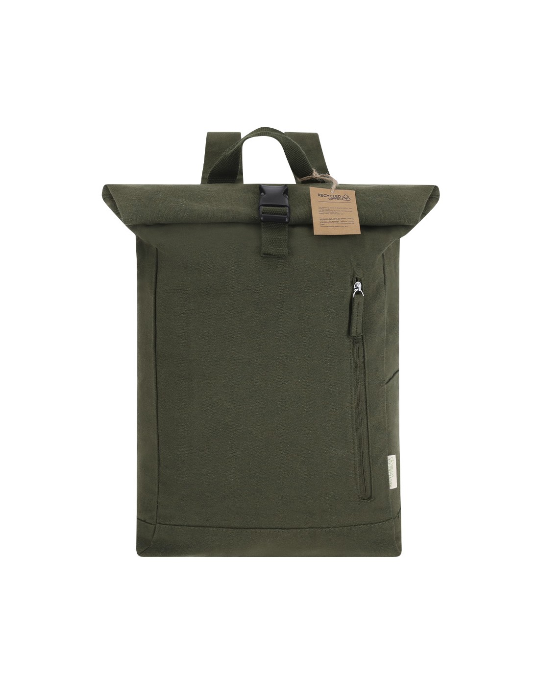 Mochila fabricada en material 100% canvas reciclado. Compartimento principal de gran capacidad con cierre de hebilla de seguridad y velcro, incluyendo un bolsillo frontal con cierre de cremallera invisible. Bolsillo lateral abierto de rápido acceso y asa superior. Con cintas para los hombros ajustables y etiqueta exterior con logotipo Algodón Reciclado. Canvas Reciclado 390 g/ m2