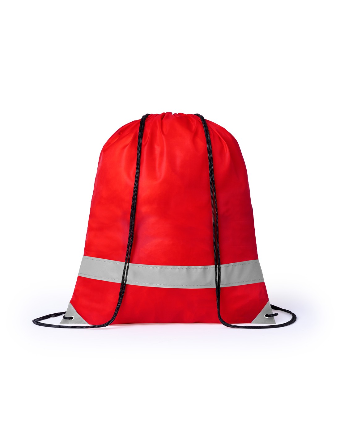 Mochila reflectante en suave poliéster 190T de alegres colores, con tira frontal reflectante. Cuerdas autocierre en color negro y esquinas reflectantes reforzadas con argollas metálicas. Reflectante Poliéster 190T