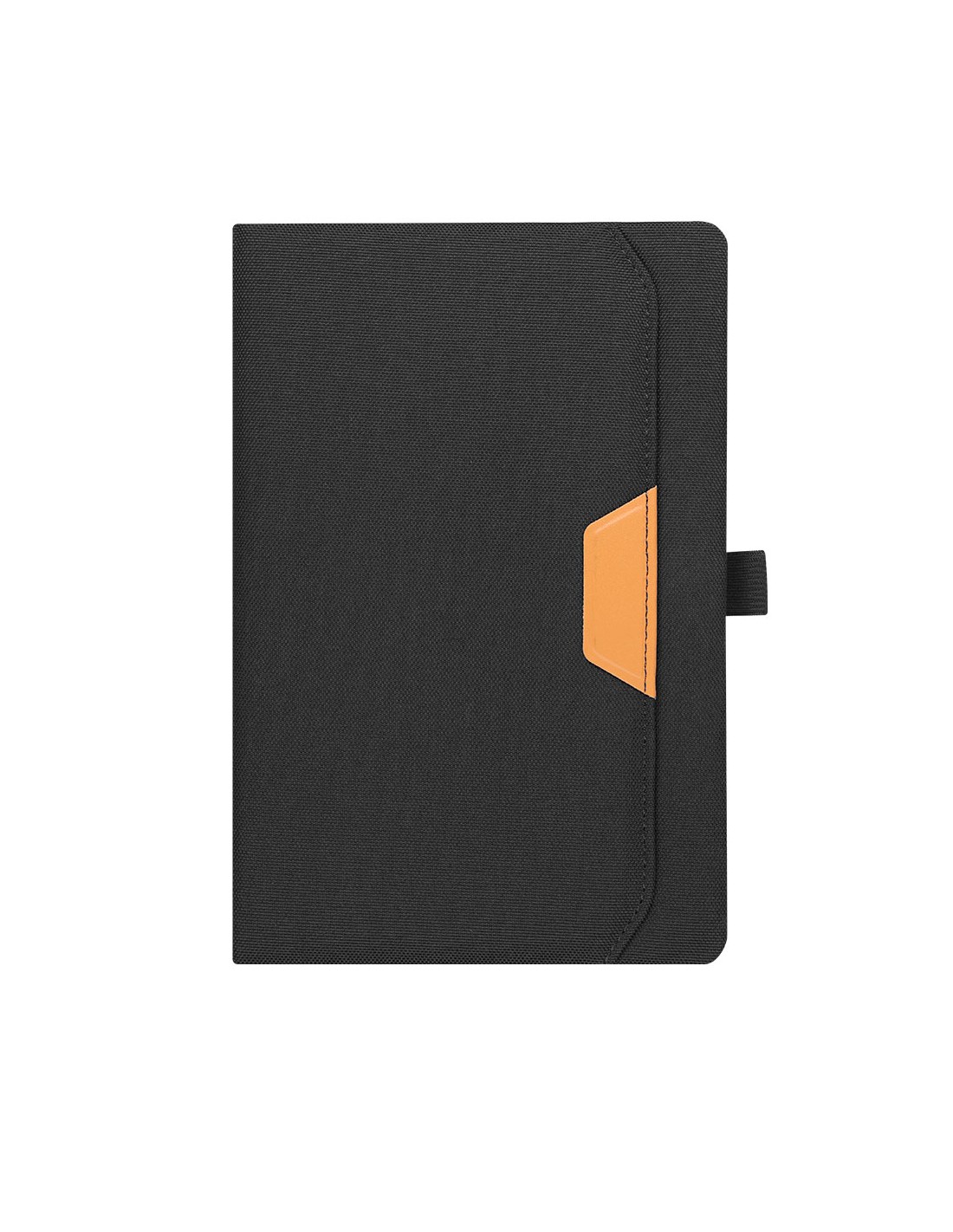 Bloc de notas en RPET, con un bolsillo exterior con distinguido detalle en PU marrón. Incluye 80 hojas de color crema a rayas y soporte elástico para bolígrafo a juego. Incluye distintivo RPET.El material RPET se elabora a partir de plástico reciclado, para así fomentar la reutilización de residuos plásticos y ayudar a la sostenibilidad del planeta. Portada Rígida. 80 Hojas Poliéster 600D RPET
