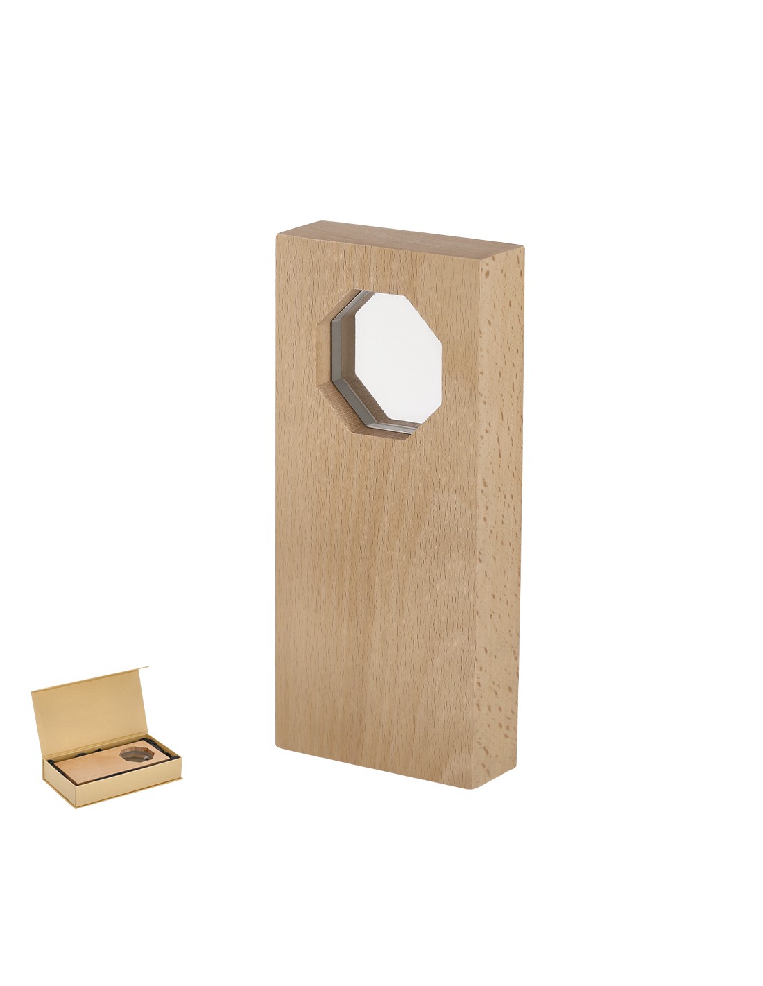 Placa trofeo con diseño de madera y en centro placa de cristal de diseño octogonal. Ideal para regalos personalizados, reconocimientos, premios y decoración. Cristal/ Madera