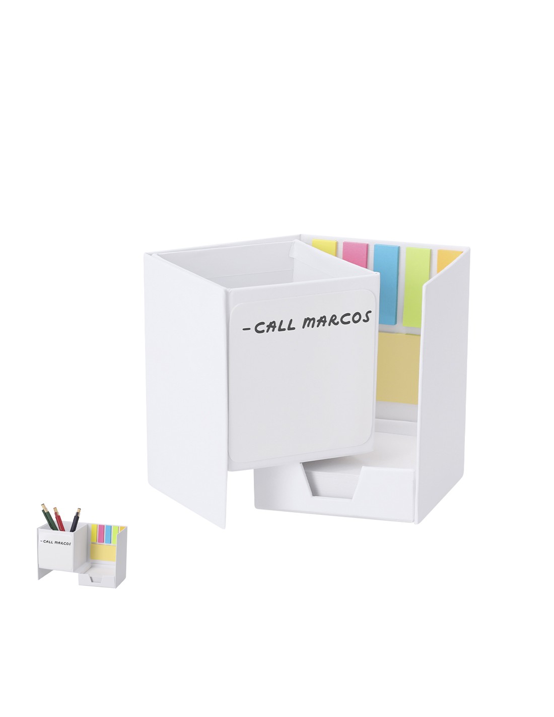 Lapicero Portanotas Pizarra en cartón reciclado. Práctico cubo desplegable con 170 hojas de 7x7 cm y 125 mininotas adhesivas de 3,8x 1,2cm en variados colores, 25 mininotas de 7,5 x 3,5 cm con práctico hueco para usar como lapicero. Lado frontal con función pizarra. 170 Hojas 7 x 7 cm. 25 Notas Adhesivas 3,5 x 7,5 cm. 125 Mininotas Adhesivas 1,2 x 3,8 cm Cartón Reciclado