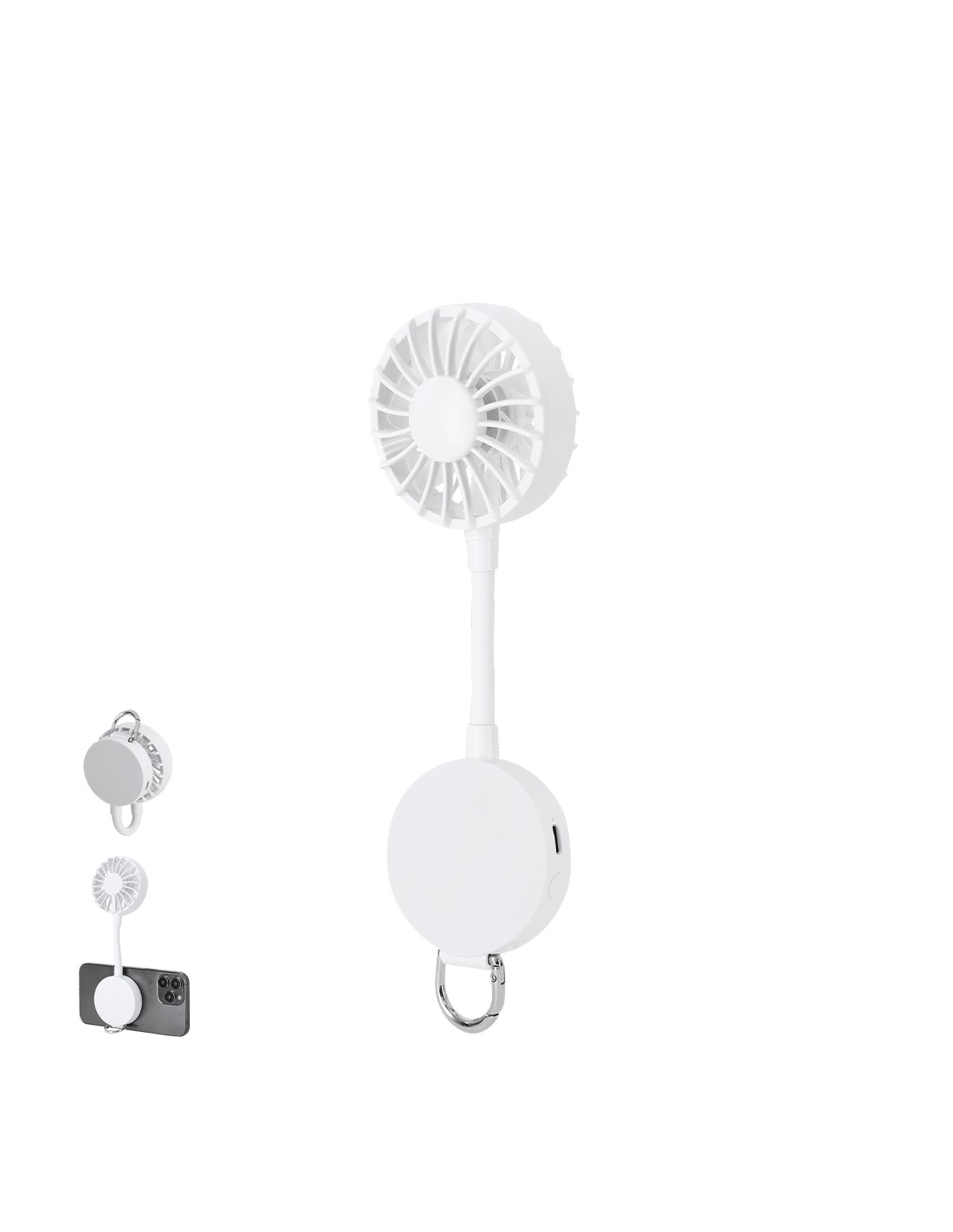 Ventilador multiposición con rotación de 360°, fabricado en ABS de color sólido y equipado con imán magnético para la sujeción con el móvil. Incluye soporte ajustable. En el extremo inferior cuenta con un mosquetón y anilla metálica. Dispone de 3 velocidades regulables mediante botón, e incorpora cable de carga USB A a USB C en el mismo color, junto con una batería de 300 mAh. Diseño compacto, funcional y portátil, ideal para uso personal en exteriores o interiores. Componentes resistentes y ensamblaje magnético para fácil plegado y transporte. Magnético. Batería 300 mAh