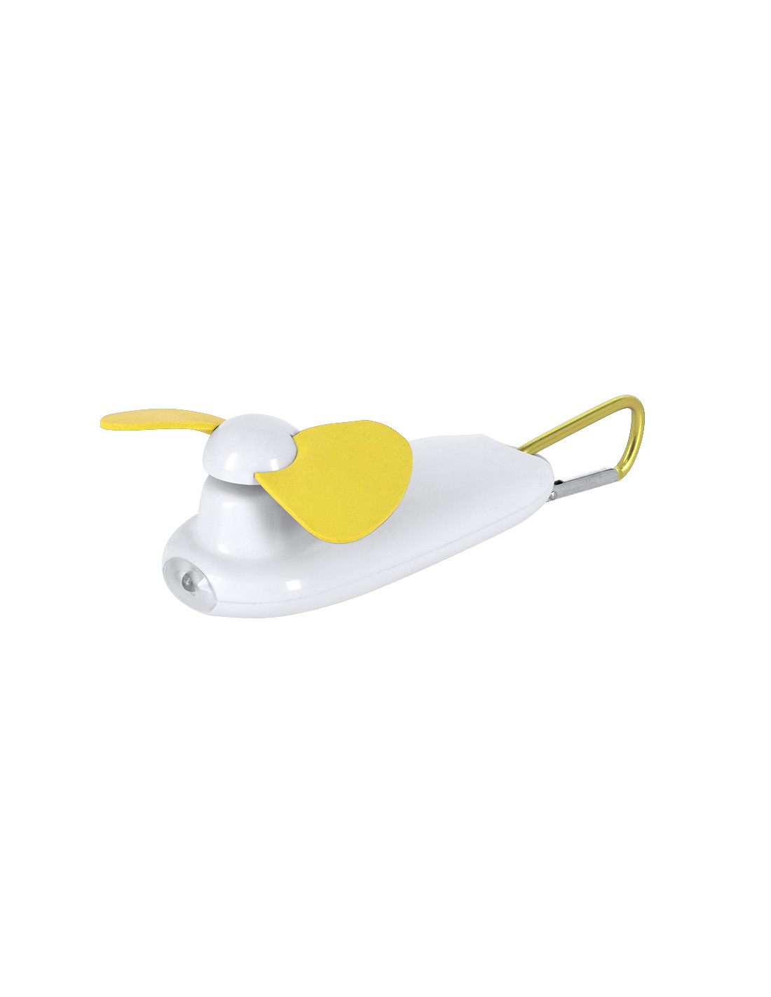Ventilador con cuerpo en ABS con acabado brillante. Aspas en suave EVA. Con botón de encendido y apagado en el lateral, linterna en la parte superior con luces LED, y en la parte inferior incluye práctico mosquetón en mismo color que las aspas para fácil transporte- Funciona con 2 pilas AA, no incluidas. 1 Led. 2 Pilas AA No Incluidas