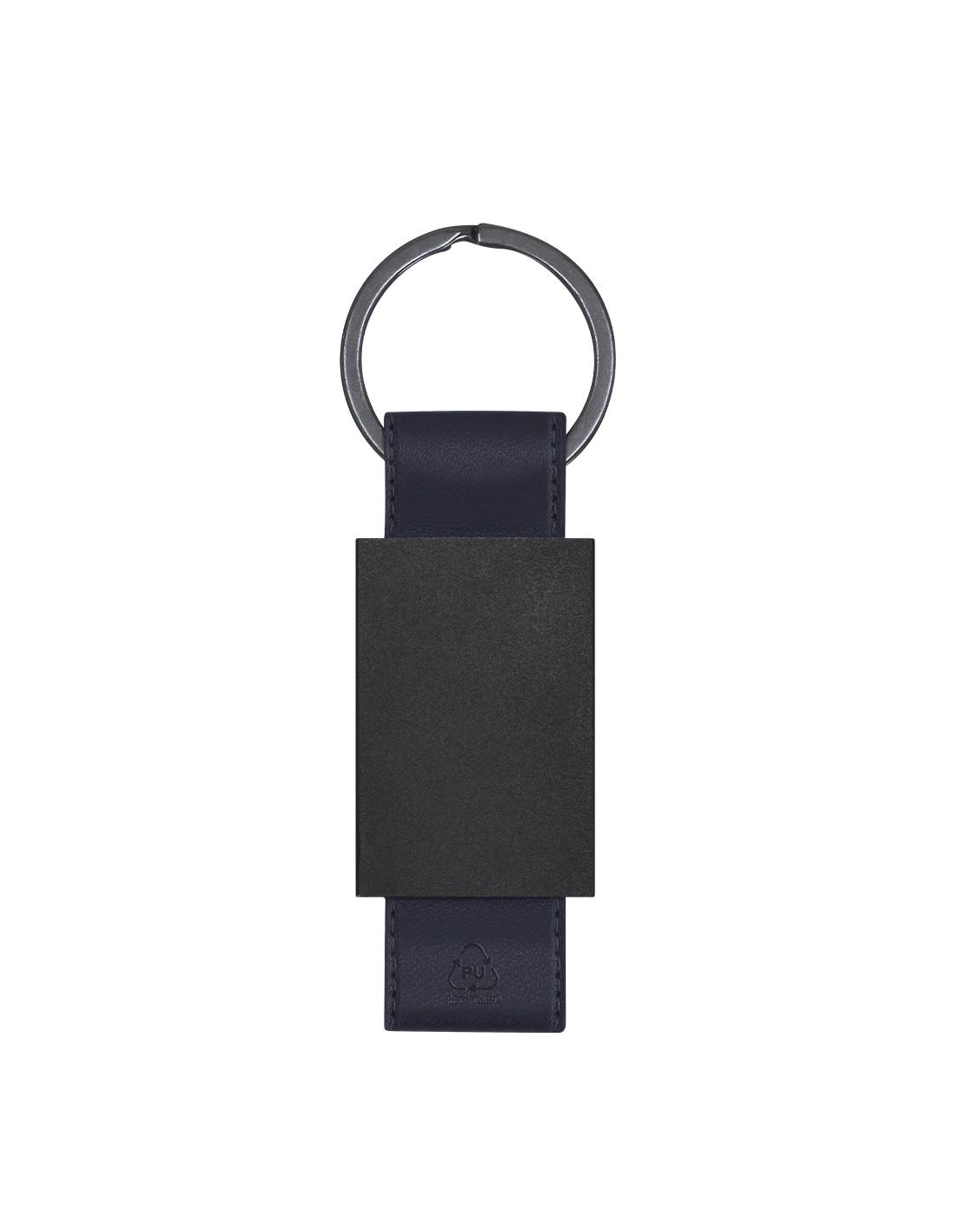 Llavero de divertido diseño con cinta de PU reciclado. Con cuerpo negro en acabado mate. PU Reciclada/ Aluminio