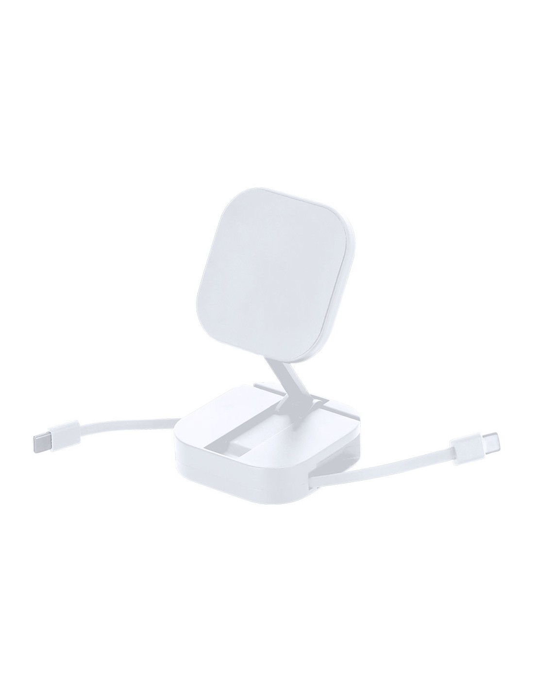 Cable cargador soporte magnético 2 en 1 de 60W, fabricado en ABS reciclado (RABS). Diseñado para la carga simultánea del smartphone a través del soporte magnético y mediante cable. Cuenta con soporte plegable con ajuste de posición. Cable retráctil de 80 cm con función de carga y transferencia de datos compatible con dispositivos que cuenten con entrada USB-C. Magnético. Apto para transferir datos. Cable Extensible. Conexión Tipo C PD 60W ABS Reciclado