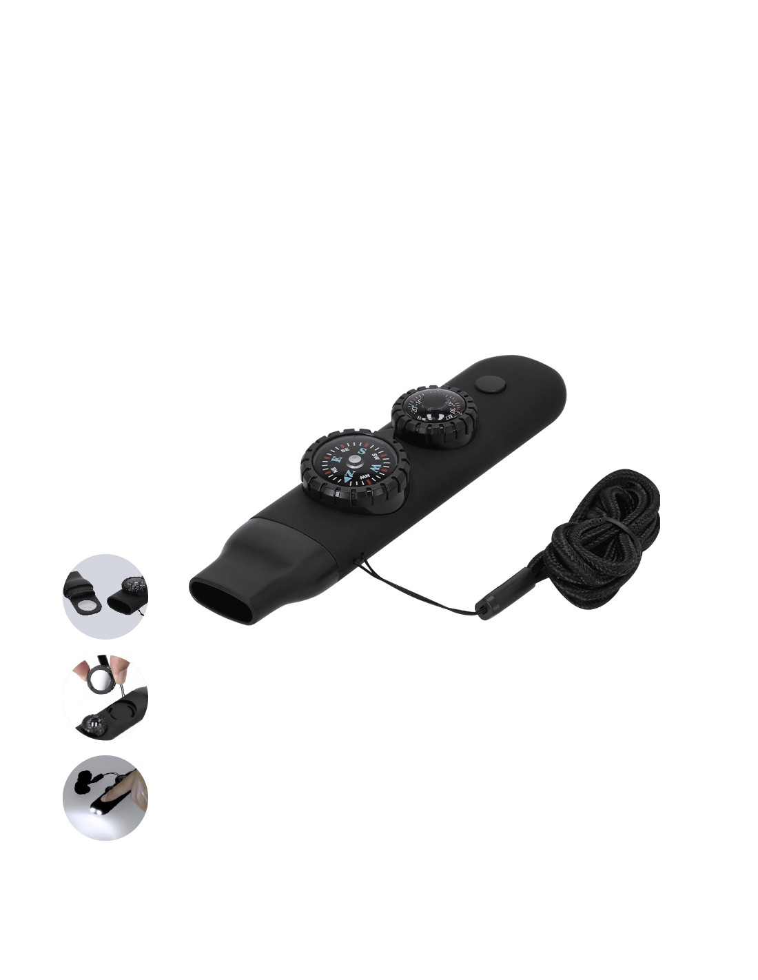 Silbato de supervivencia fabricado en resistente ABS con acabado gomoso. Integra 6 funciones esenciales:- Brújula de 2,55 cm de diámetro, con indicaciones de Norte, Sur, Este y Oeste.- Silbato de alta potencia, ideal para emitir señales de emergencia.- Termómetro con rango de temperaturas de -20 ºC a 50 ºC.- Lupa de 2 cm de diámetro, perfecta para observar detalles pequeños o incluso para encender fuego mediante concentración de luz solar.- Espejo, incorporado en la parte inferior de la brújula.- Linterna con 2 LEDs y botón de encendido/apagado en la parte superior.Incluye un práctico cordón para facilitar su transporte, ideal para llevarlo cómodamente colgado al cuello. 2 Ledes. 6 Funciones. Pilas Botón Incluidas