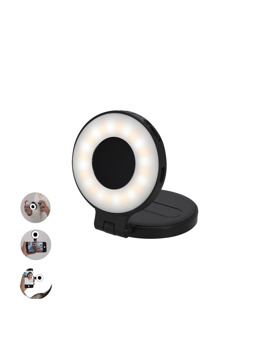 Anillo de luz led con acople para smartphone magnético, fabricado en resistente ABS. 24 ledes, con 3 modos de luz e intensidad regulable y recargable por USB (cable Tipo C) de batería 450 mAh. Con soporte extensible, ideal para ponerlo en diferentes posiciones en tu smartphone u ordenador Magnético. Extensible. 24 Ledes. 3 Posiciones de Luz. Batería 450 mAh