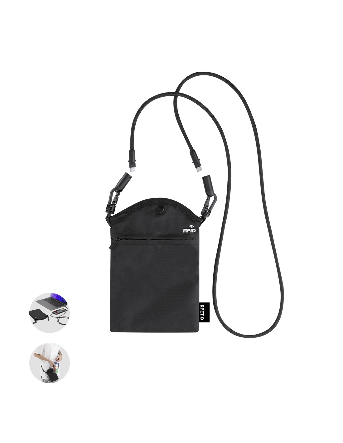 Portatodo fabricado en RPET. Compartimento principal con cierre de botón y bolsillo en la parte frontal con sistema de cierre en cremallera. Incluye sistema de protección RFID, diseñado para bloquear accesos no autorizados a tarjetas contactless.Cinta de transporte 2 en 1 unida mediante mosquetones con función de cable apto para transferir datos, con conexión Tipo C de 60W. Incluye distintivo logotipo RFID y RPET. Protector RFID. Cable Cargador, Apto para transferir datos, Conexión Tipo C PD 60W Poliéster 210D RPET