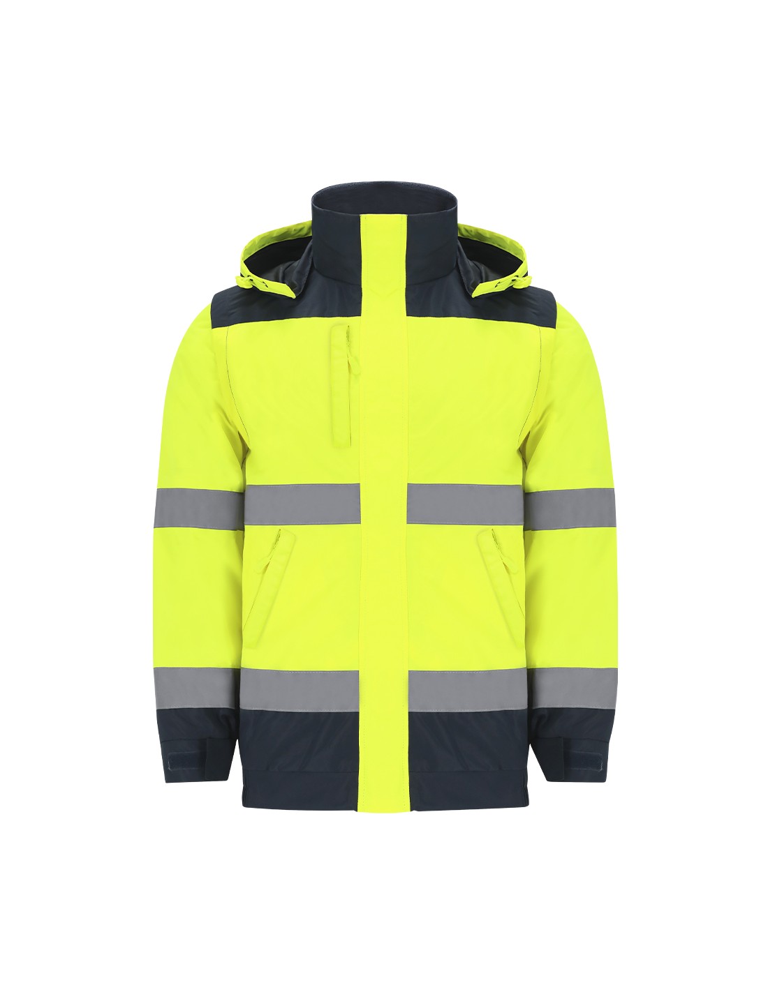 Chaqueta acolchada de alta visibilidad con diseño bicolor. Confeccionada en tejido exterior impermeable y costuras termoselladas, ofrece protección contra el viento y la lluvia.Con dos bandas reflectantes horizontales en el cuerpo y dos en las mangas, que aseguran una visibilidad óptima en condiciones de baja luminosidad.Incluye capucha enrollable, cierre frontal con cremallera y solapa con velcro. así como puños ajustables y cintura elástica para mayor ajuste.Cuenta con dos bolsillos laterales con cierre de cremallera, un bolsillo en el pecho derecho y un bolsillo interior con cierre de cremallera.Incorpora acceso trasero interior para reprocesos o personalización. Tratamiento Impermeable. Cremallera Interior para Impresión Exterior: Poliéster. Interior: Poliéster/ Polar Fleece