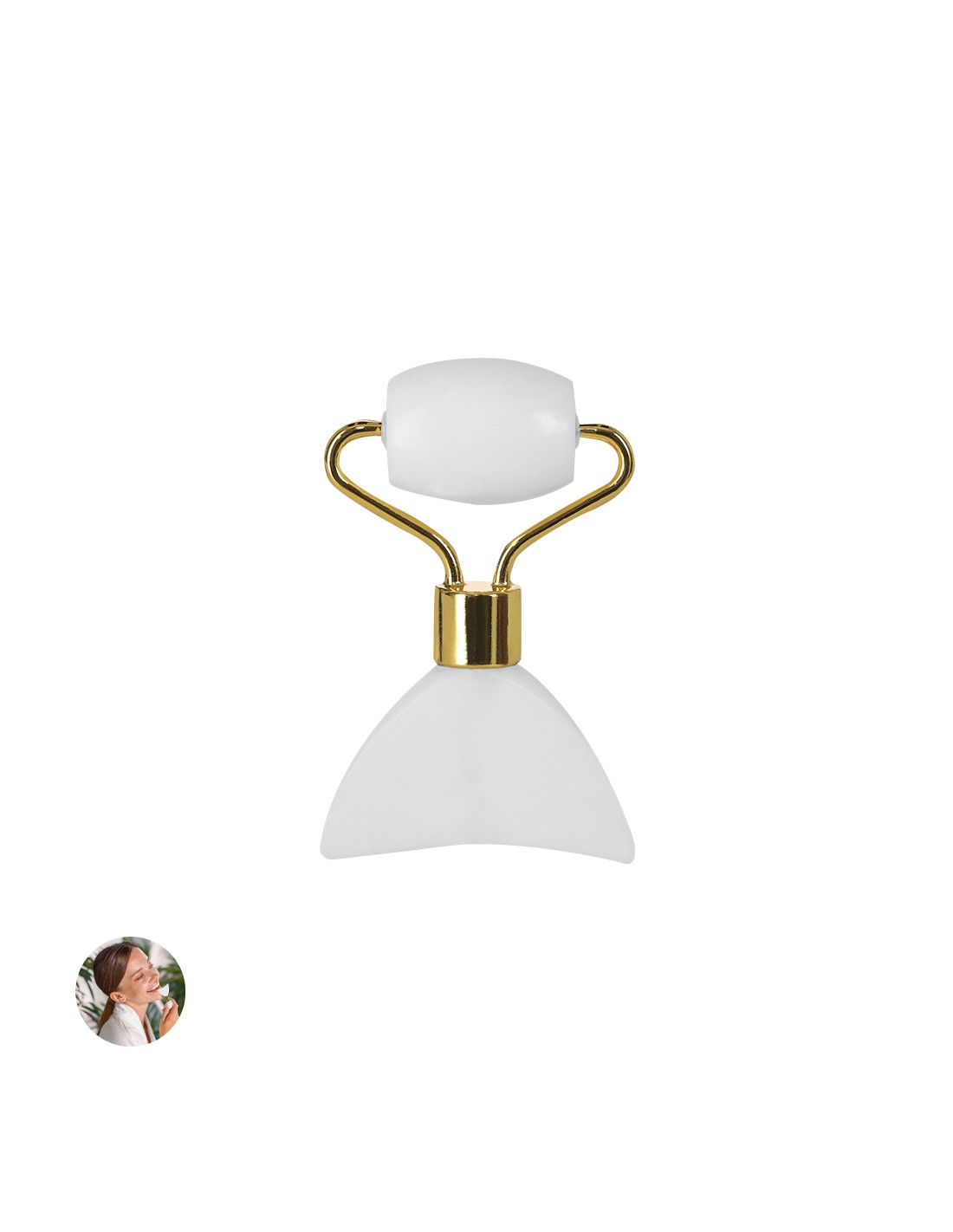 Rodillo facial de alta calidad fabricado en piedra jade blanco. Agradable masajeador de mano para el rostro, con cilindro facial fabricados en suave piedra pulida y espátula. Piedra Jade Blanca