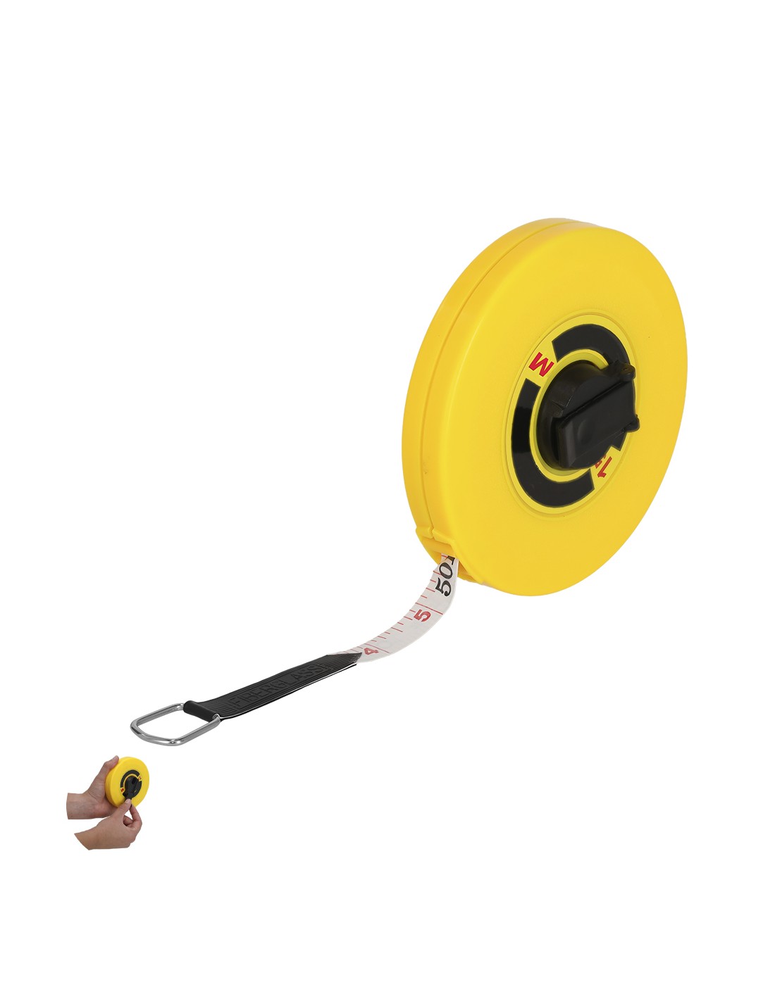 Cinta métrica 15 metros de largo en estuche PP y mecanismo en manivela. Escala impresa en cinta de PVC en negro para cm, y rojo para las pulgadas.