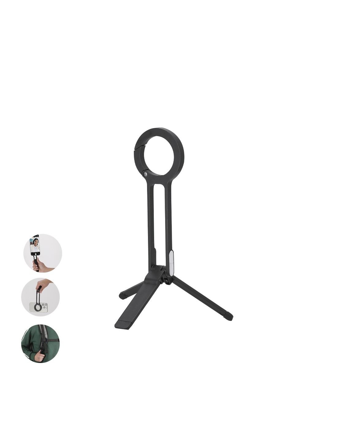 Soporte multifuncional magnético plegable fabricado en resistente ABS en acabado mate. Con base desplegable para graduar altura. En la parte superior dispone de enganche mosquetón para fácil transporte. Magnético. Plegable