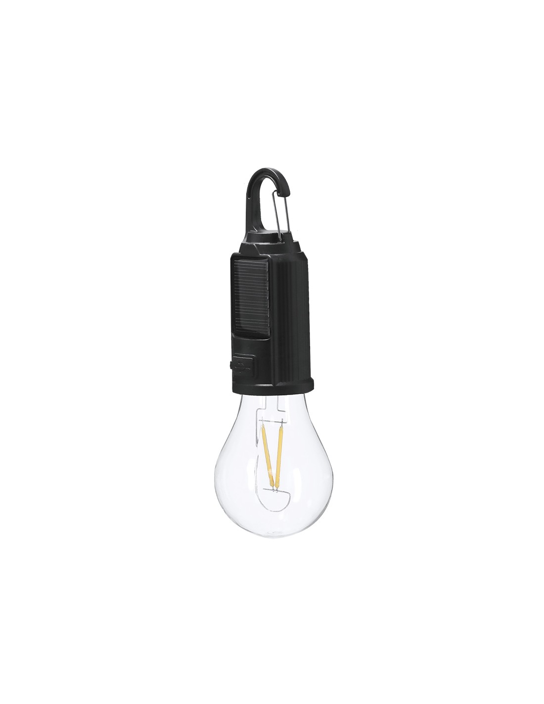 Lampara con original diseño de bombilla con cuerpo en ABS. Batería de 300 mAh y carga solar. Dispone de sensor nocturno que se activa automáticamente al no recibir luz solar. Dispone de carga a través de cable Tipo C, además de incluir mosquetón para fácil transporte. Carga Solar. Sensor Nocturno. Batería 300 mAh
