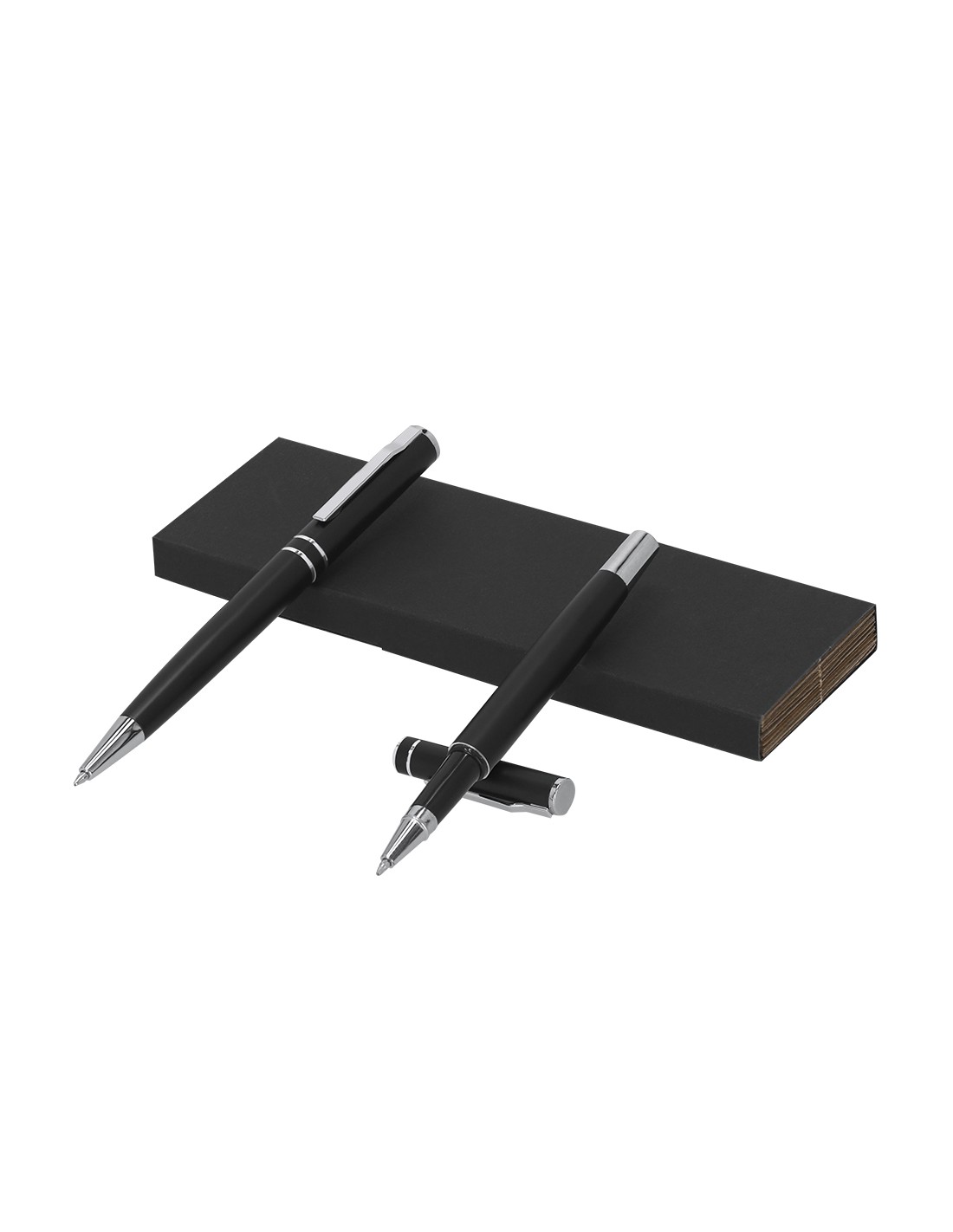 Set de bolígrafo y roller fabricados en Aluminio Reciclado, en elegante diseño negro mate con distinguidos accesorios en acabado plateado. Bolígrafo de mecanismo pulsador y roller con capucha, ambos con clip metálico. En tinta azul y logotipo de Aluminio Reciclado. Presentación en elegante estuche negro. Bolígrafo y Roller Aluminio Reciclado