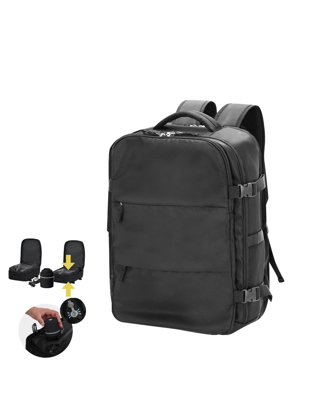Mochila al vacío con elegante diseño en suave nylon incluye bomba de vacío de 35W. Cuenta con un compartimento principal extensible, en él se encuentra un bolsillo interior de vacío. El tercer compartimento dispone de un bolsillo con múltiples opciones de almacenamiento. Además de dos bolsillos de pequeño tamaño en la parte frontal. Laterales con hebillas para ajuste. Espalda y cintas acolchadas, y cinta para trolley. Asa de agarre y en la parte superior. Parte Trasera y Cintas Acolchadas. Bomba de Vacío Incluida Nylon