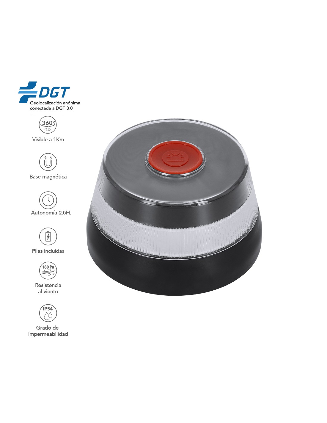 Luz de emergencia V16 Geolocalizada para vehículos. Fabricada conforme a la normativa de seguridad vigente y homologada por laboratorio acreditado IDIADA, según requisitos de la DGT , con número de homologación marcado en la parte inferior del artículo. Incluye una tarjeta SIM conectada con Telefónica Tech, con servicio de comunicación de datos hasta 12/2038, sin gastos ni cuotas adicionales. De activación manual y con base de fijación magnética. Resistencia al viento de hasta 180Pa, visibilidad 360° -hasta 1 km de distancia- y resistencia al agua conforme a estándares IP54. De tamaño compacto para guardar en cualquier compartimento del vehículo y tenerla a mano en caso de emergencia. Presentada en caja individual de diseño. Manual incluido (español e inglés). Alimentación a pilas (3xAA pilas alcalinas incluidas), con una autonomía de 2.5 horas. 12 Ledes Intermitentes. Magnética. 3 Pilas AA Incluidas