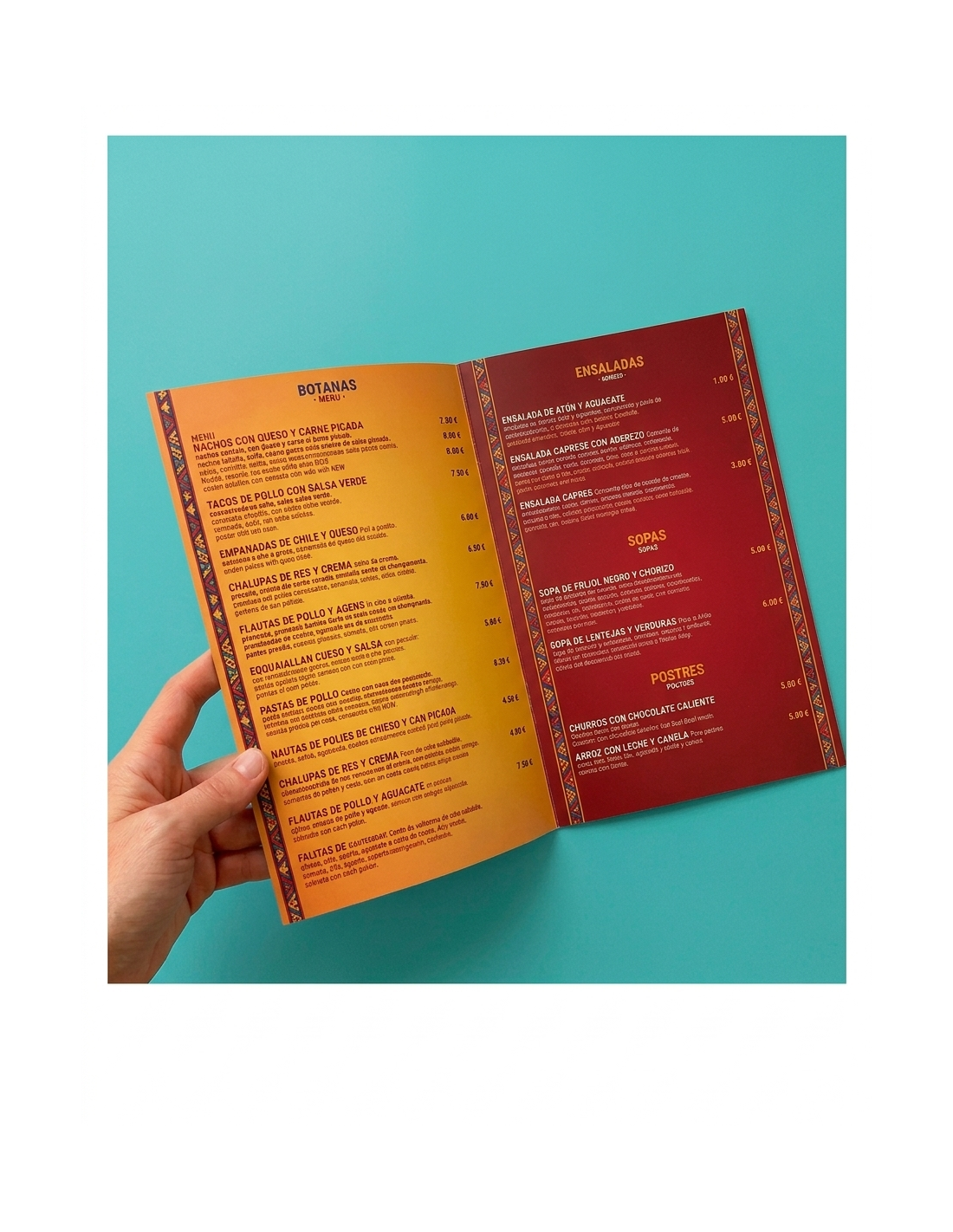 • Estucado 350g Plastificado: Protege tu menú con una fina capa de plástico que aporta cuerpo y durabilidad. Disponible con plegado en díptico o tríptico.