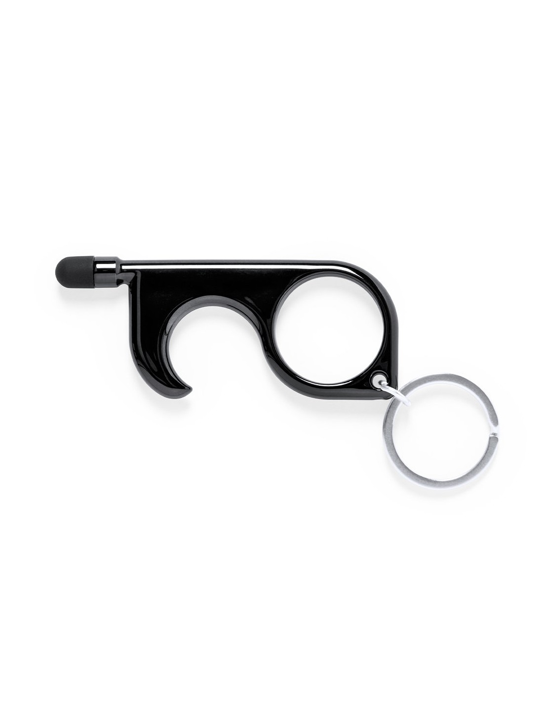 Llavero higiénico anti-contacto con bolígrafo y puntero integrados. Fabricado en resistente ABS de acabado metalizado y disponible en variada gama de colores. Especialmente diseñado para evitar tocar con las manos superficies de uso común (picaportes de puertas, interruptores, grifos de uso público, cajeros automáticos...). Con cómodo troquel para el dedo y presentado en bolsa individual de diseño. Recomendado para marcaje en tampografía. Bolígrafo Puntero Incluido