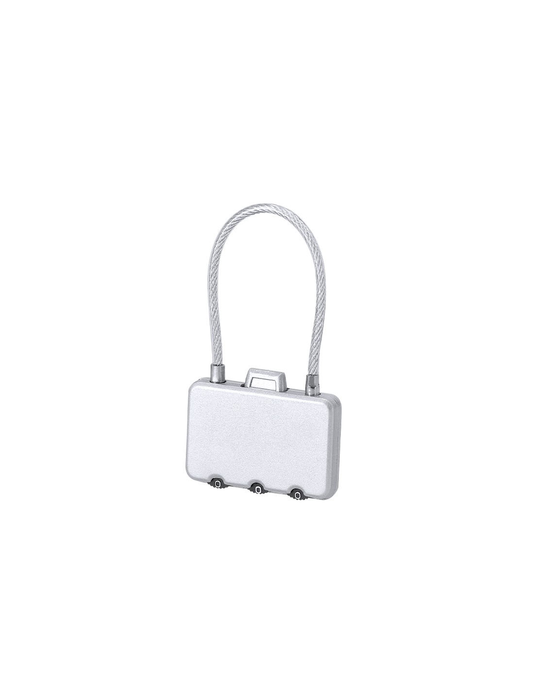 Candado con contraseña numérica metálico de 3 dígitos, botón de apertura en la parte superior y cierre de cable de acero. Metal