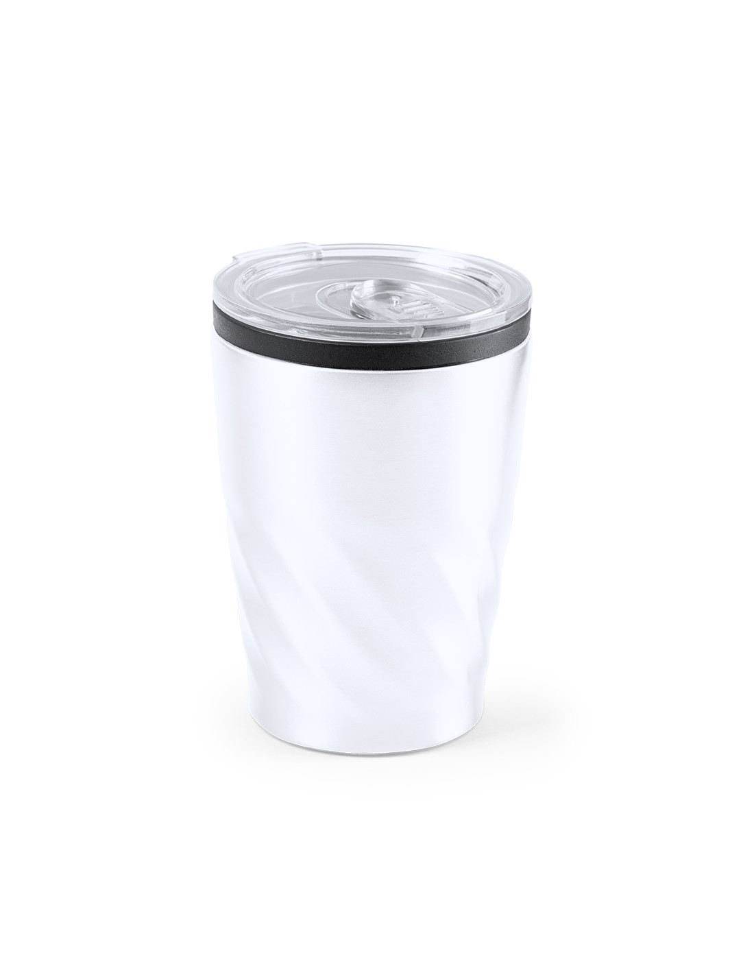 Vaso fabricado en acero inox de 350ml de capacidad. Cuerpo con diseño biselado, con anilla de color negro. Con original tapón dosificador transparente y abrefácil. Es ideal para tener en tu escritorio, mesa o en cualquier superficie donde disfrutar tranquilamente de tu bebida favorita. 350 ml Acero Inox/ PP
