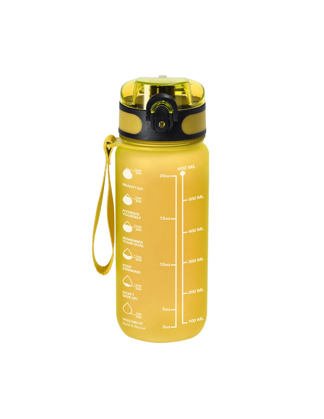 Bidón de 750 ml de capacidad, fabricado en resistente RPET y en acabado translúcido mate. Ingeniosa tapadera con resorte de fácil apertura pulsando el botón frontal, con cierre de seguridad. Sellado óptimo de tapón a rosca y asa para un cómodo transporte en el mismo color. Libre de BPA. 750 ml RPET