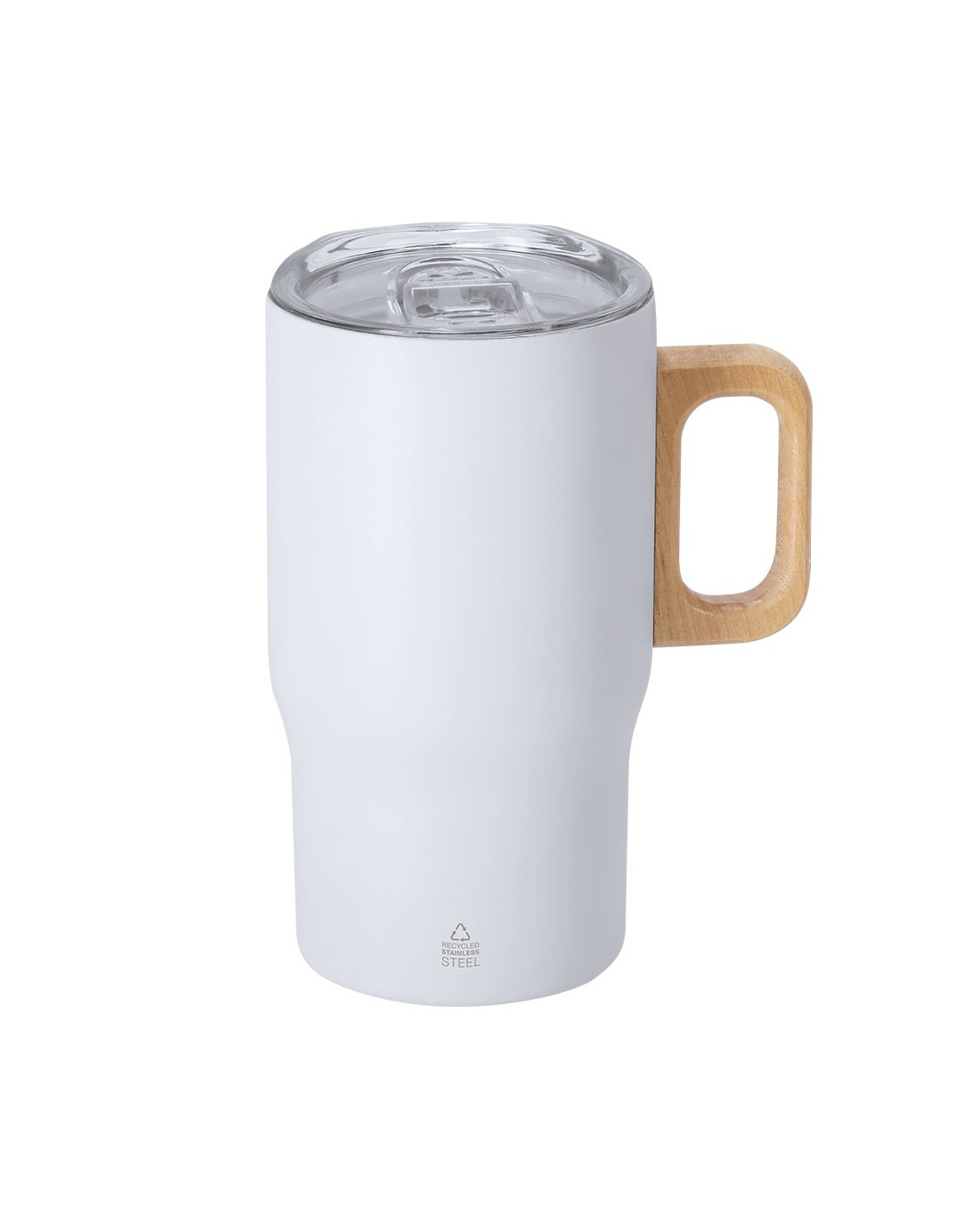 Taza térmica en Acero Inox Reciclado de doble pared con 400 ml de capacidad y asa rígida de madera para mayor comodidad. Exterior en acabado biselado mate. Incluye tapadera con sistema de cierre a presión transparente y dosificador de fácil apertura abatible, libre de BPA. Es ideal para tener en tu escritorio, mesa o en cualquier superficie donde disfrutar tranquilamente de tu bebida favorita. Incluye distintivo de Acero Inox Reciclado. 400 ml Acero Inox Reciclado/ Madera