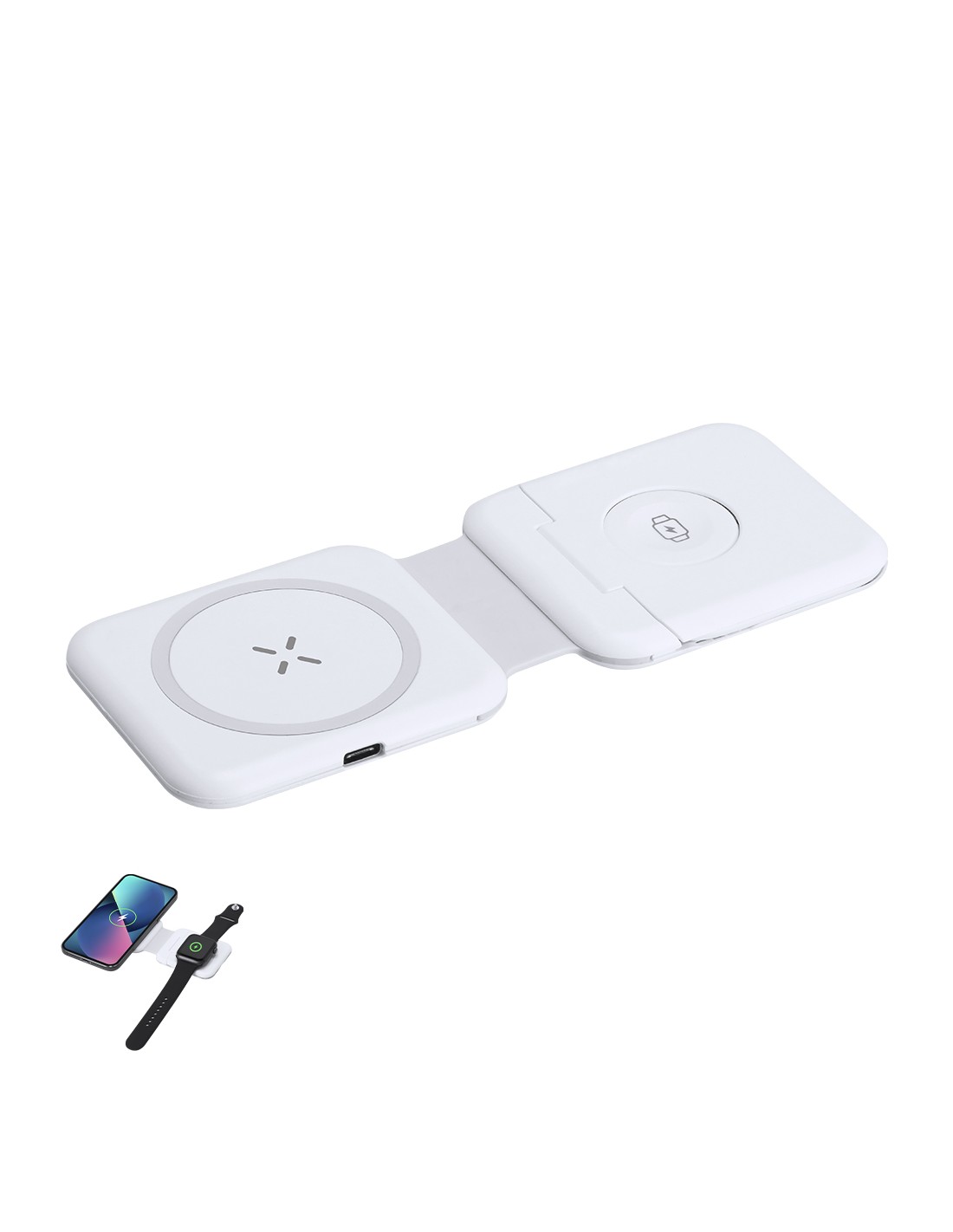 Completo multicargador inalámbrico 15W con soporte para gadgets 3 en 1 plegable. Diseñado para la carga simultánea del smartphone/auriculares y smartwatch: una estación de carga todo en uno. Incluye set de cables Tipo C y adaptador USB, aptos para la transferencia de datos. Inalámbrico 15W. Set Cables Cargadores Incluido. Apto para transferir datos. Conexión Tipo C