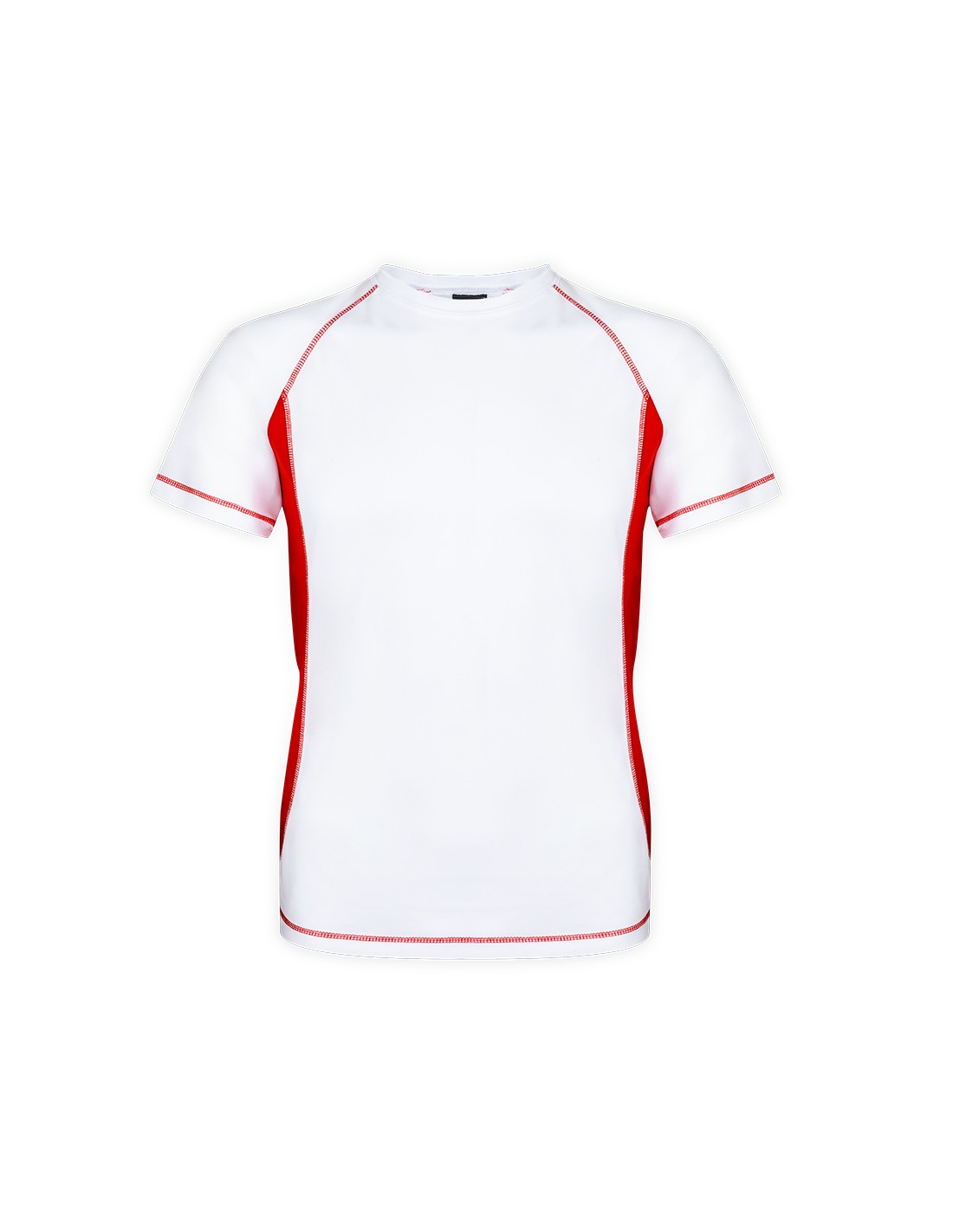 Camiseta técnica para adulto en material 100% poliéster transpirable de 135g/m2. Diseño en color blanco con costuras de refuerzo y laterales en vivos colores. Disponible en tallas S, M, L, XL, XXL. Transpirable Poliéster 135 g/ m2