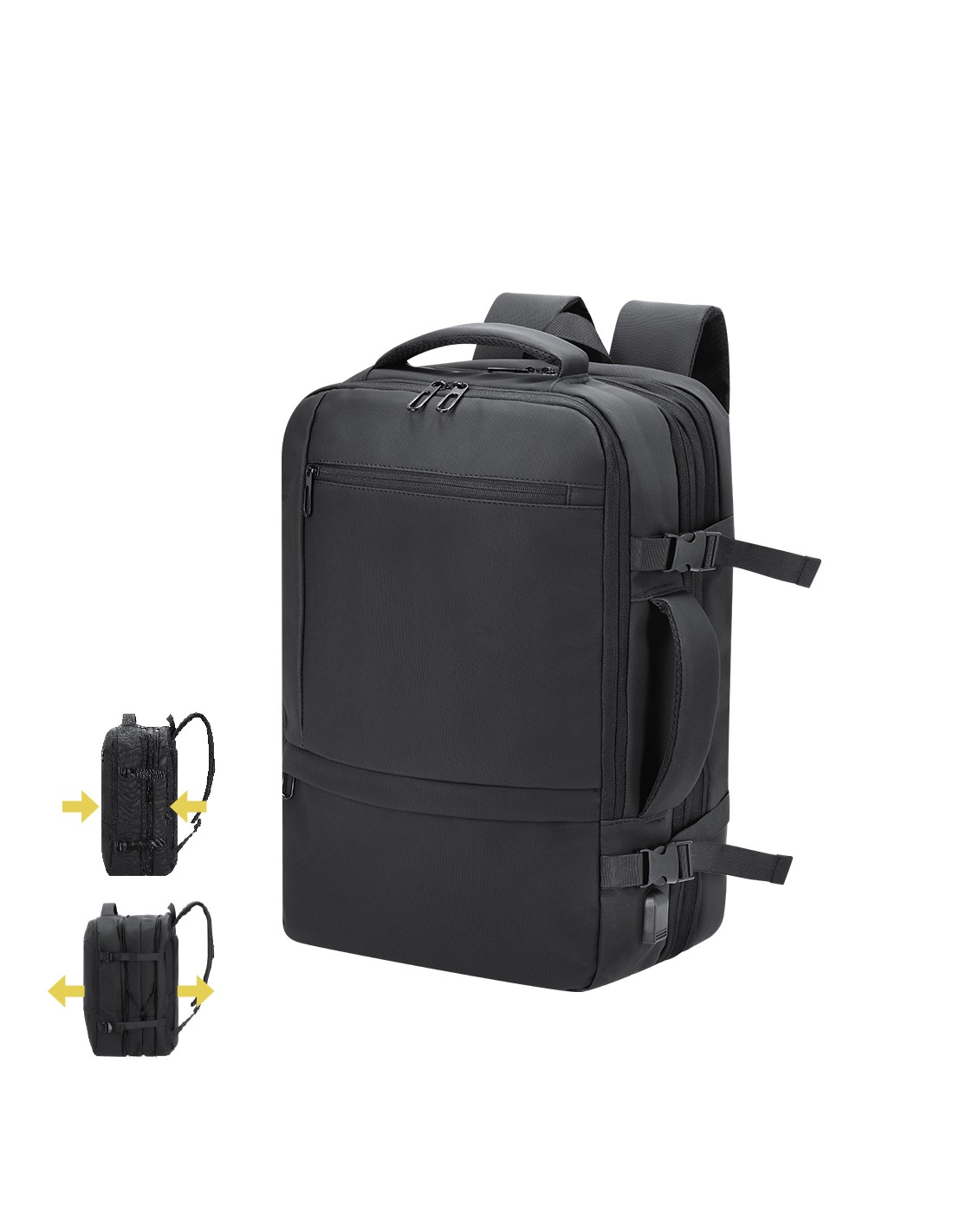 Mochila multifunción extensible confeccionada en resistente PU.Cuenta con una excelente transpirabilidad en la zona trasera y en la cinta para los hombros, facilitando la disipación del calor gracias a sus cintas y respaldo acolchados. Las cintas anchas están diseñadas para aliviar la presión en los hombros, permitiendo llevar la mochila cómodamente durante largos periodos.Perfecta para cualquier situación por tener múltiples compartimentos:2 bolsillos frontales de diferentes tamaños.1 bolsillo trasero antirrobo para mayor seguridad.3 compartimentos grandes centrales con doble tirador, uno de ellos portatodo, un bolsillo central de gran capacidad para guardar ropa y/o complementos con organizador en su interior, y otro perfecto para llevar portátil de hasta 17 pulgadas.Incluye cinta para fijarla en trolley y maletas. Ajuste de cierre en el pecho.Bolsillo en cinta izquierda para hombros, ideal para guardar llaves u objetos de pequeño tamaño. Además, cuenta con un puerto de carga USB y con correa pectoral con hebilla para un ajuste seguro. Perfecta para viajes o para el día a día por sus cintas ajustables, adaptándose a todo estilo de vida. Extensible. Conexión USB. Bolsillo Acolchado para Portátil. Parte Trasera y Cintas Acolchadas PU